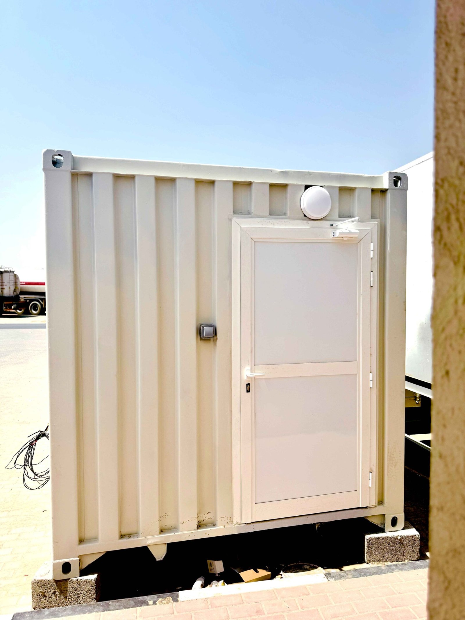 The container toilet unit includes an electric motor with a 1 HP automatic pressure pump to ensure strong and consistent water pressure throughout the facility. Additionally, energy-efficient LED lighting and waterproof switches and sockets provide safe, bright lighting in all areas, suitable for any time of day. A Distribution Board (DB) and Earth Leakage Circuit Breaker (ELCB) are also included to enhance safety and protect against electrical faults.