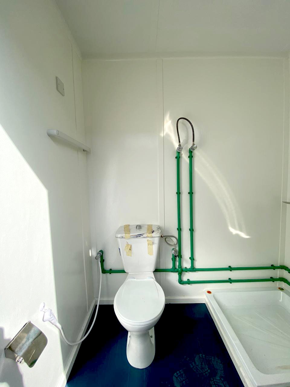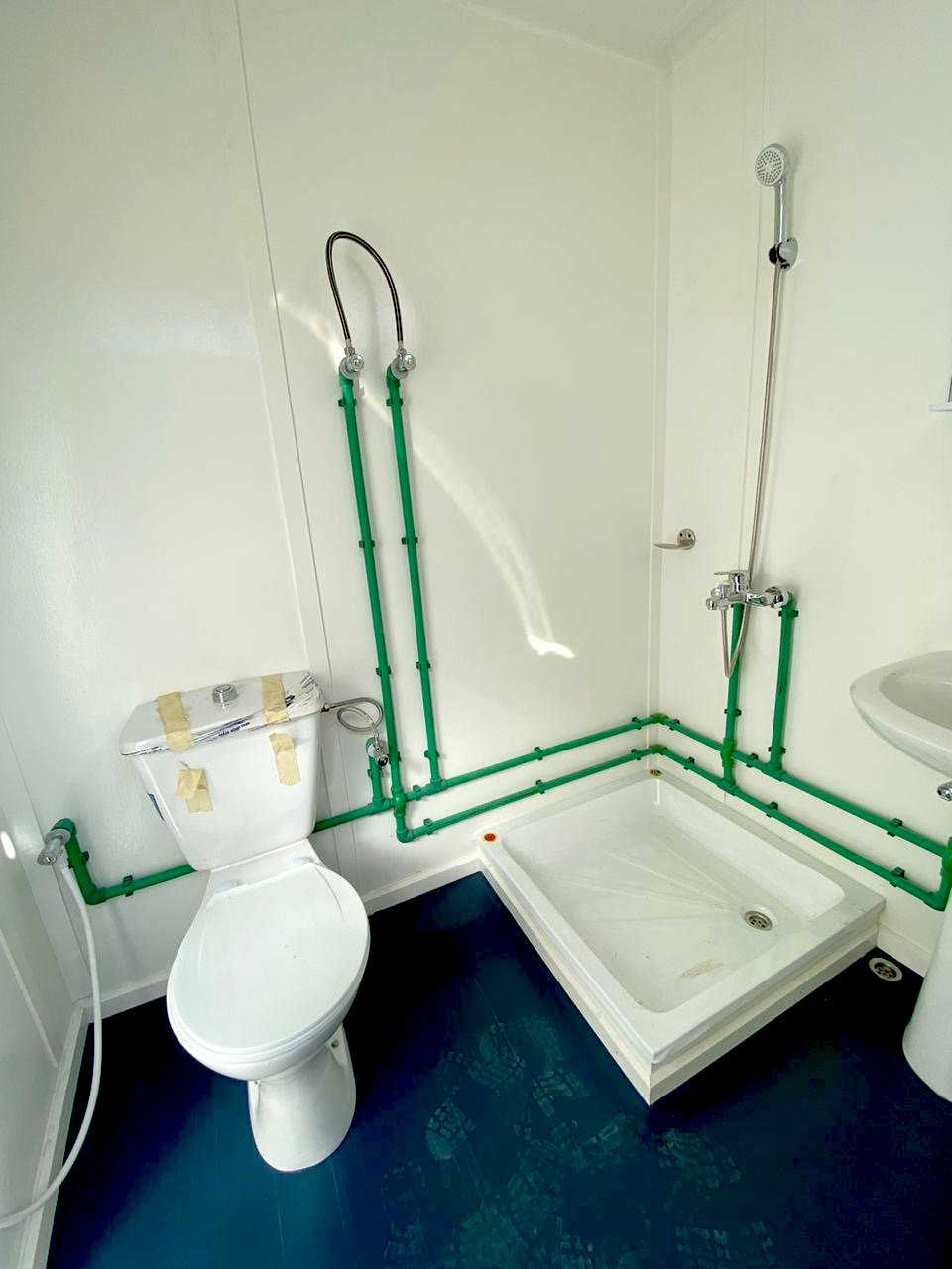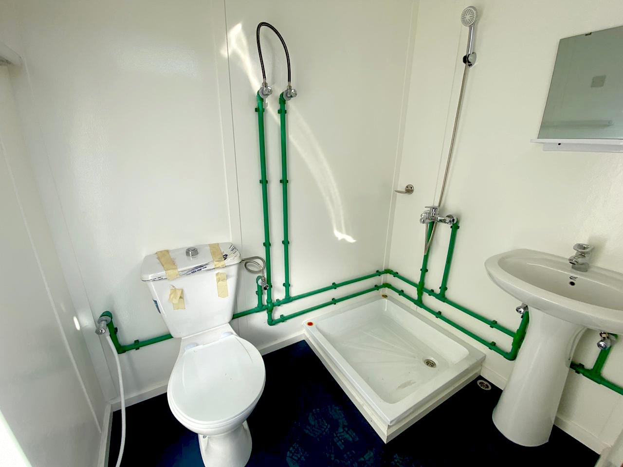 - Bathroom Facilities: Each porta cabin is equipped with a bathroom that includes a WC, shower, washbasin, and fittings, meeting the hygiene and convenience needs of personnel on-site.